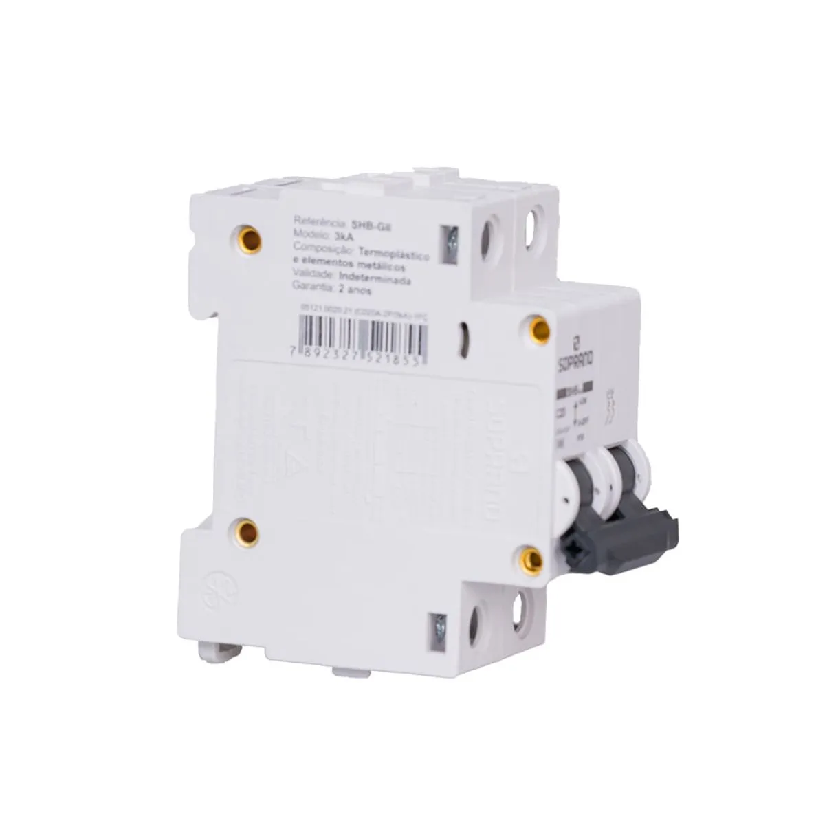 Detalhes técnicos: • Modelo: Disjuntor SHB GII • Tensão nominal: 127/220V • Frequência: 50/60 Hz • Vida mecânica: 10.000 manobras | elétrica: 4.000 manobras • Número de polos: 2 • Tensão máxima de isolamento de 415(Vca) • Temperatura ambiente de 30°C • Curva de disparo: C • Capacidade de interrupção: 3 kA • Padrão de instalação: DIN • Grau de proteção IP20 • Normas técnicas: Certificação Inmetro ABNT NBR 60898-1 (até 63A) • Fabricado em termoplástico de engenharia • Dimensões do Produto: 74,25mm X 35,00mm X 80,80mm (C x L x A) • Código interno de referência: 05121.0020.21 • 2 anos de garantia Conteúdo da Embalagem: 1 Disjuntor