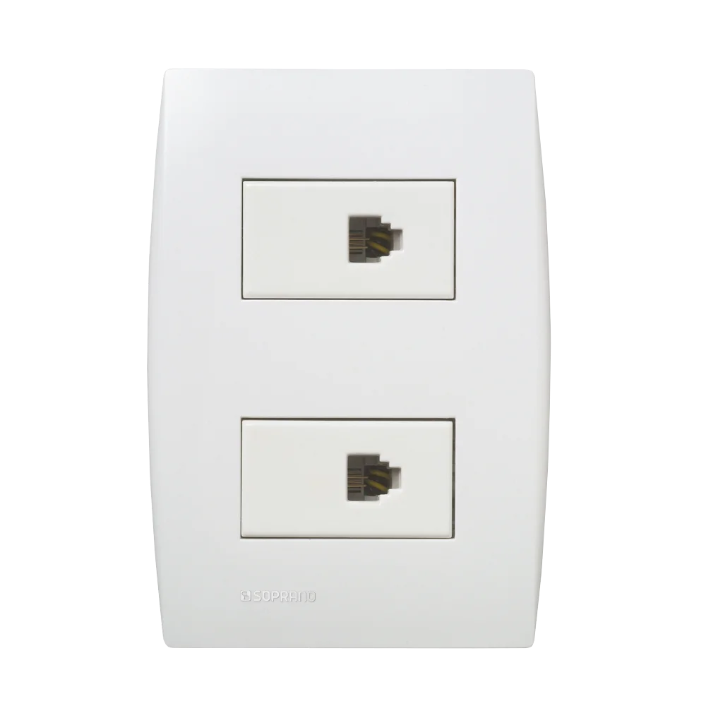 Conjunto 2 Tomadas RJ11(4fios) 4 fios.Design clássico e clean que combinam com o seu estilo. Perfil mais fino com ausência de parafusos aparentes. Produzido em material termorplástico de alta performance, com aditivo anti UV e anti poeira que auxilia na conservação do produto.